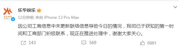 乐华娱乐回应被列为经营异常:因工商信息中未更新联络信息导致,已和工商部门积极联系