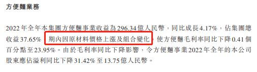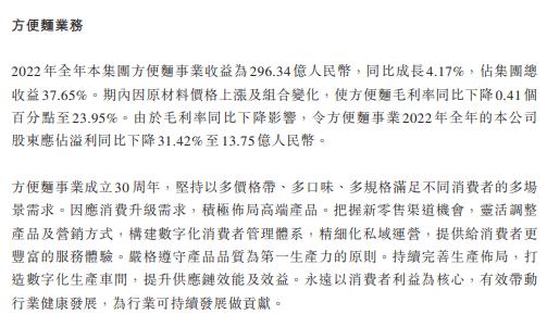 分业务来看,2022年公司方便面业务收益为296.34亿元,同比增长4.17%,占总收益的37.65%,毛利率同比下降0.41%至23.95%。受毛利润下降影响,方便面业务2022年的公司股东应占溢利为13.75亿元,同比下降31.42%。
