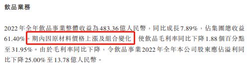 饮料业务整体收益为483.36亿元,同比增长7.89%,占总收益的61.40%,毛利率同比下降1.88%至31.95%。由于毛利率下降,饮料业务在2022年的公司股东应占溢利为13.78亿元,同比下降25.00%。