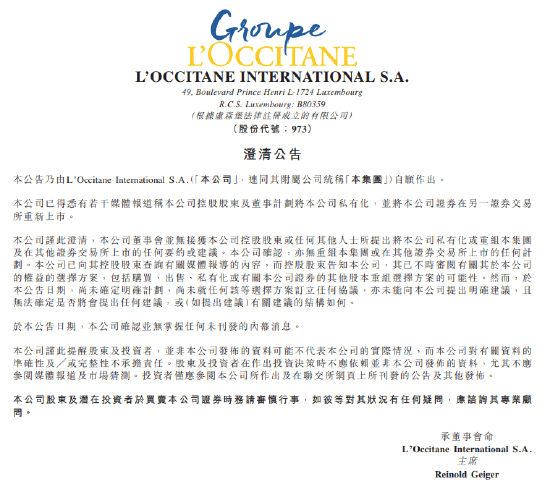 港交所公告显示,欧舒丹表示,并无接获控股股东或任何其他人士提出将公司私有化或重组集团及在其他证券交易所上市的任何要约或建议。