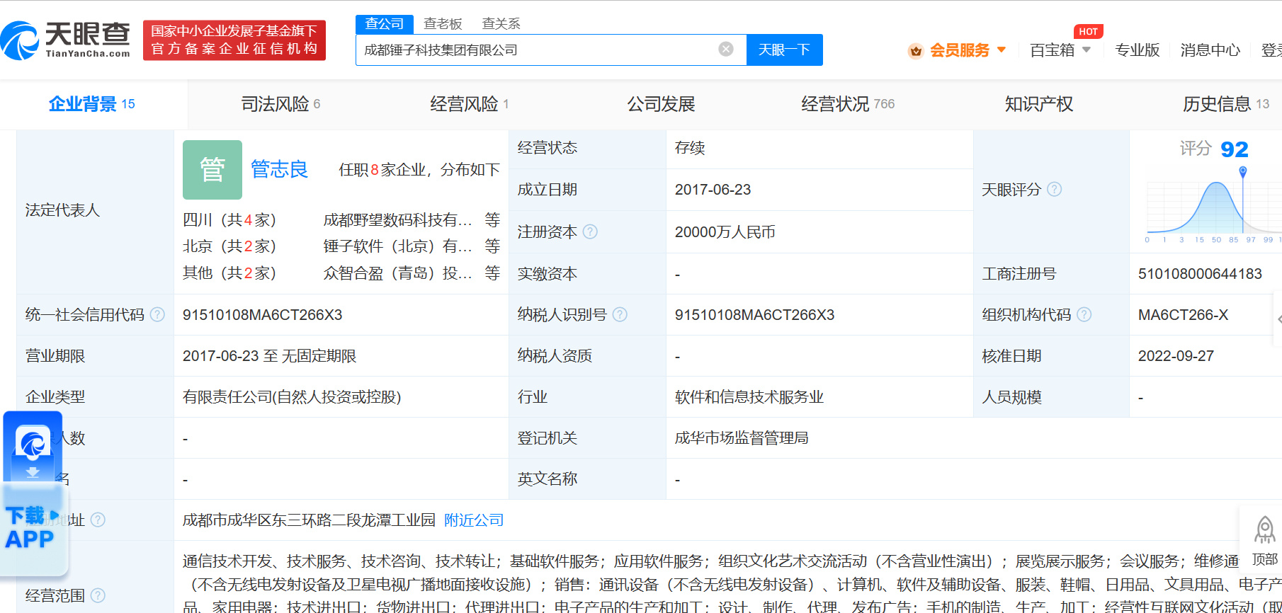 天眼查App显示,近日,成都锤子科技集团有限公司因通过登记的住所或者经营场所无法联系,被成华市场监督管理局列入经营异常名录。该公司成立于2017年6月,注册资本2亿人民币,法定代表人为管志良,经营范围含基础软件服务,手机的制造、生产、加工,经营性互联网文化活动等。股东信息显示,该公司由罗永浩和锤子科技(成都)股份有限公司分别持股50%。
