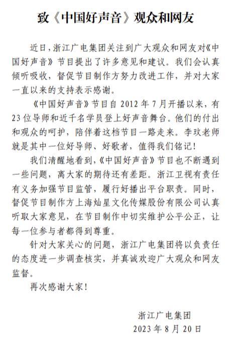 此前,此前“李玟控诉好声音”音频引热议。8月20日晚,浙江广电集团发文致《中国好声音》观众和网友,表示针对大家关心的问题,浙江广电集团将进一步调查核实,欢迎广大观众和网友监督。