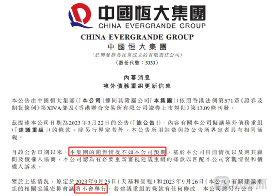 此前,恒大债务重组表决会议一推再推,直到9月22日直接发布公告称,由于销售情况不如预期,债务重组会议将不会举行。