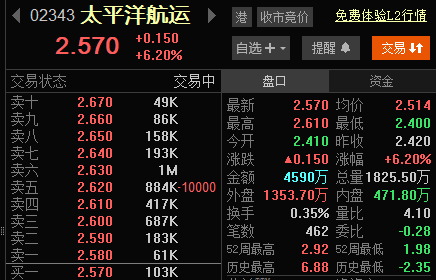 太平洋航运(02343)现涨近7%,截至发稿,涨6.20%,报2.57港元,成交额4590万港元。