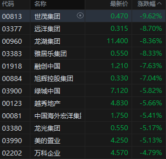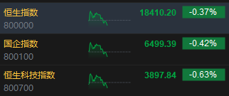 5月8日消息,周三港股上午盘三大指数集体冲高回落,临近午盘加速走低。恒生科指一度涨超1%。截至午间收盘,恒生指数跌0.37%报18410.20点,恒生科技指数跌0.63%,国企指数跌0.42%。内房股走势低迷,龙湖集团一度跌超8%,中国奥园、融创中国均跌超7%。