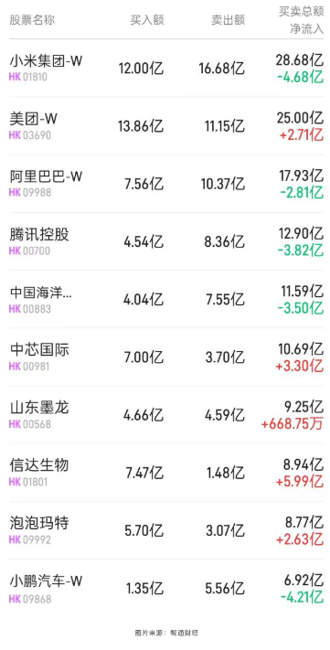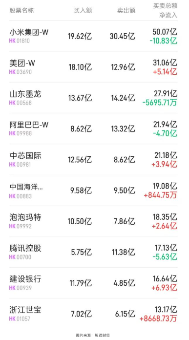 北水净买入最多的个股是美团-W(03690)、中芯国际(00981)、建设银行(00939)。北水净卖出最多的个股是小米集团-W(01810)、腾讯(00700)、阿里巴巴-W(09988)。